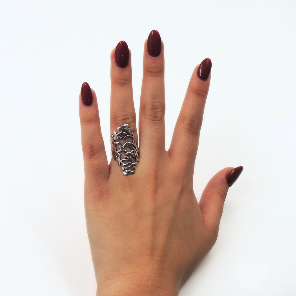 El espectacular Anillo 'Entrelazado' es una joya statement que captura la belleza orgánica y el movimiento fluido de la naturaleza. Su diseño único presenta un patrón calado y alargado en plata fina 950, que evoca ramas, redes de coral o delicados tejidos. Las formas se entrelazan con armonía, creando una textura visual rica y un aire de elegancia. Su estructura ligera y de gran tamaño lo convierte en una pieza de impacto moderno y estilo libre.