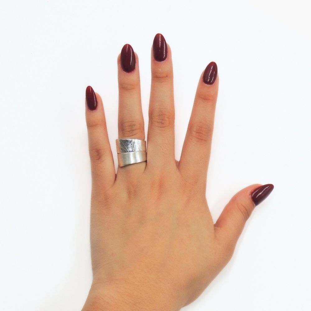 Material: Plata fina 950 con acabado pulido y texturizado (patrón geométrico).