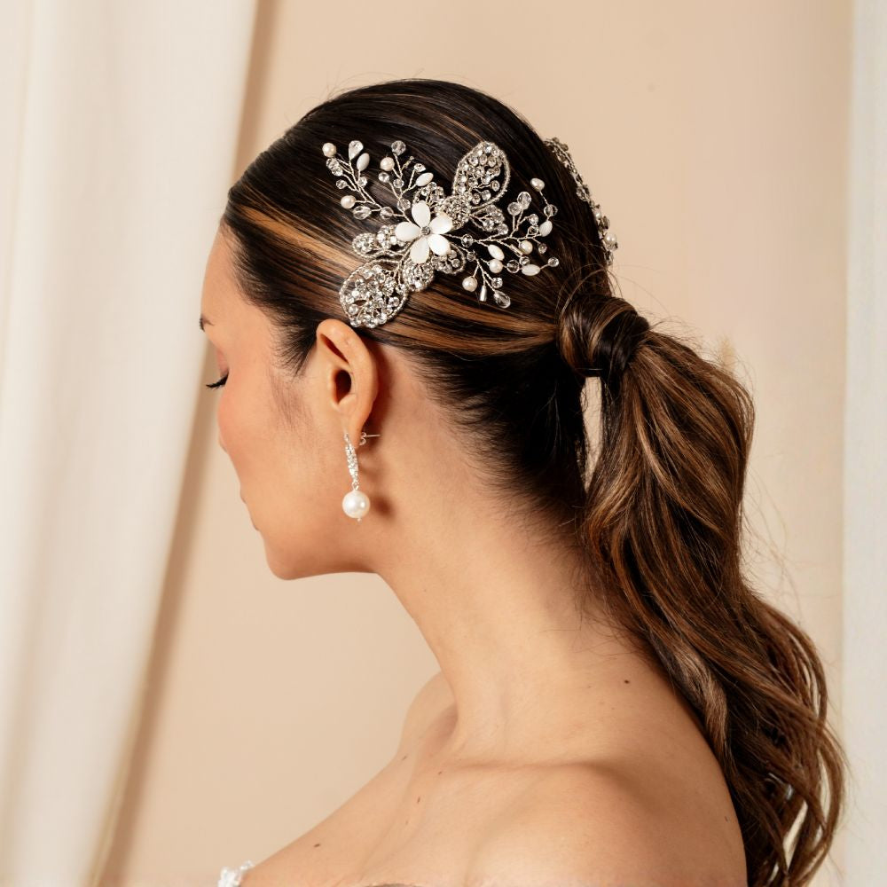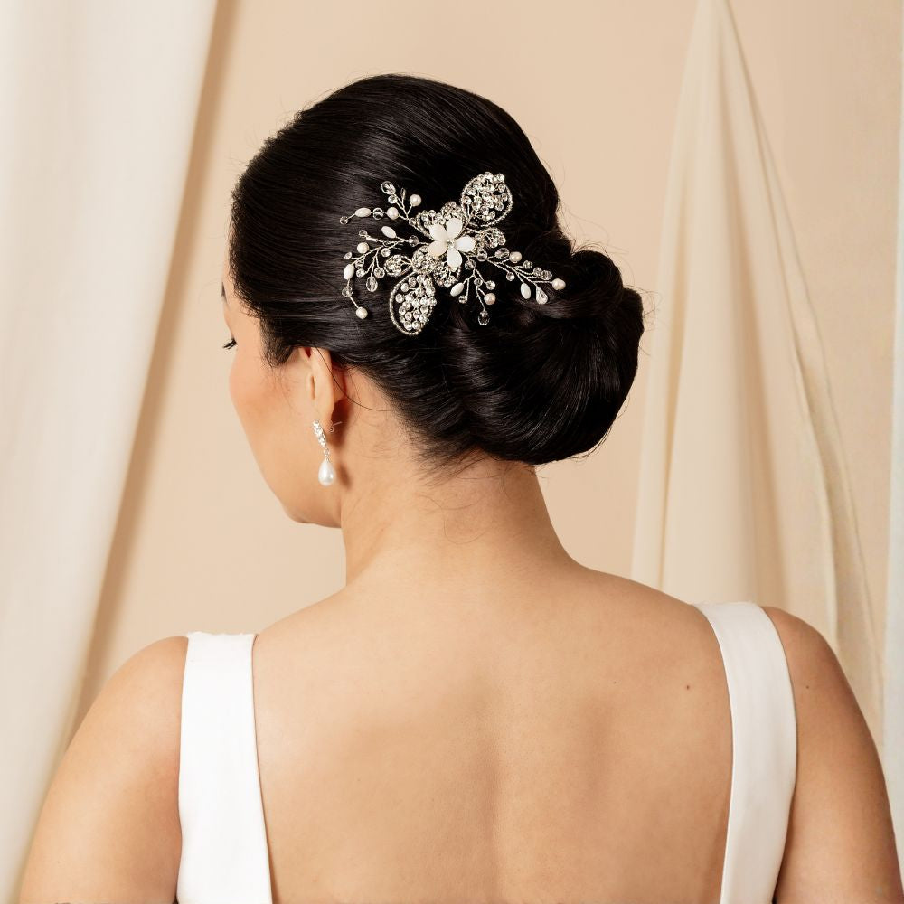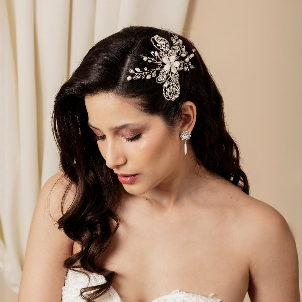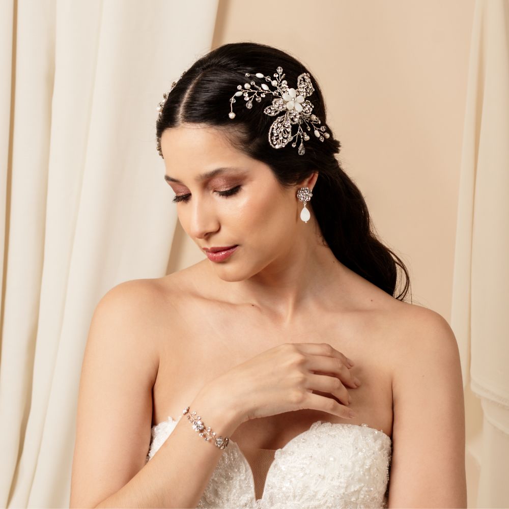 Su diseño evoca una distinción sutil y etérea, perfecta para bodas de tarde o de noche, donde el reflejo de los cristales realza el encanto luminoso y romántico. Ideal para novias que buscan un accesorio nupcial refinado con un toque celestial con un diseño versátil ideal para cualquier tipo de peinado.