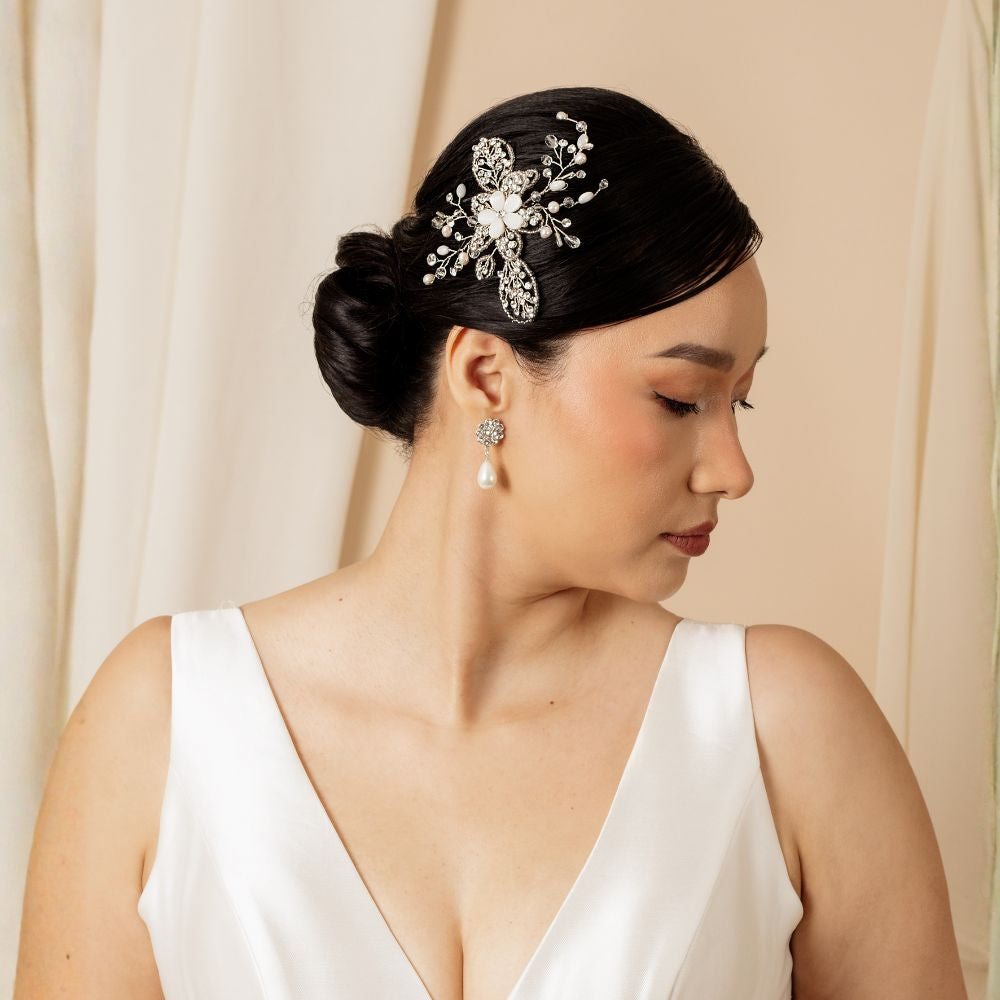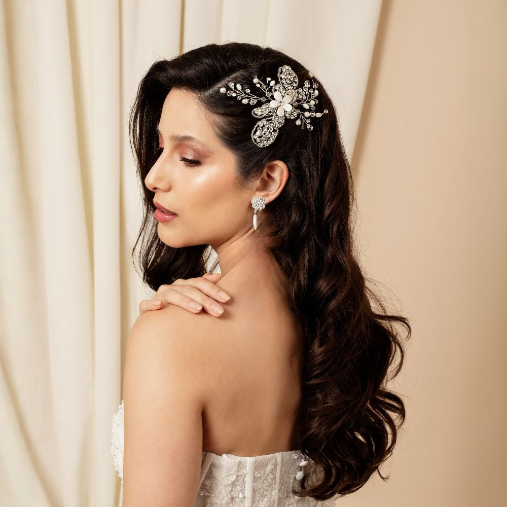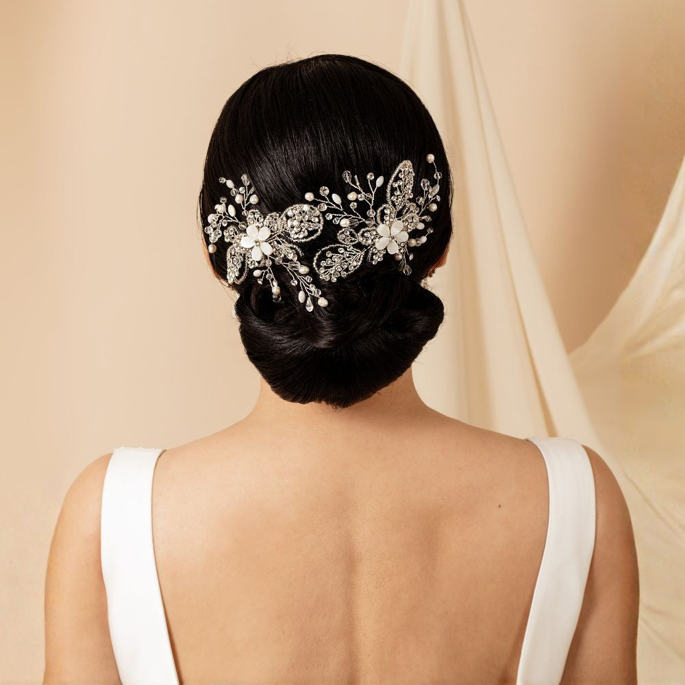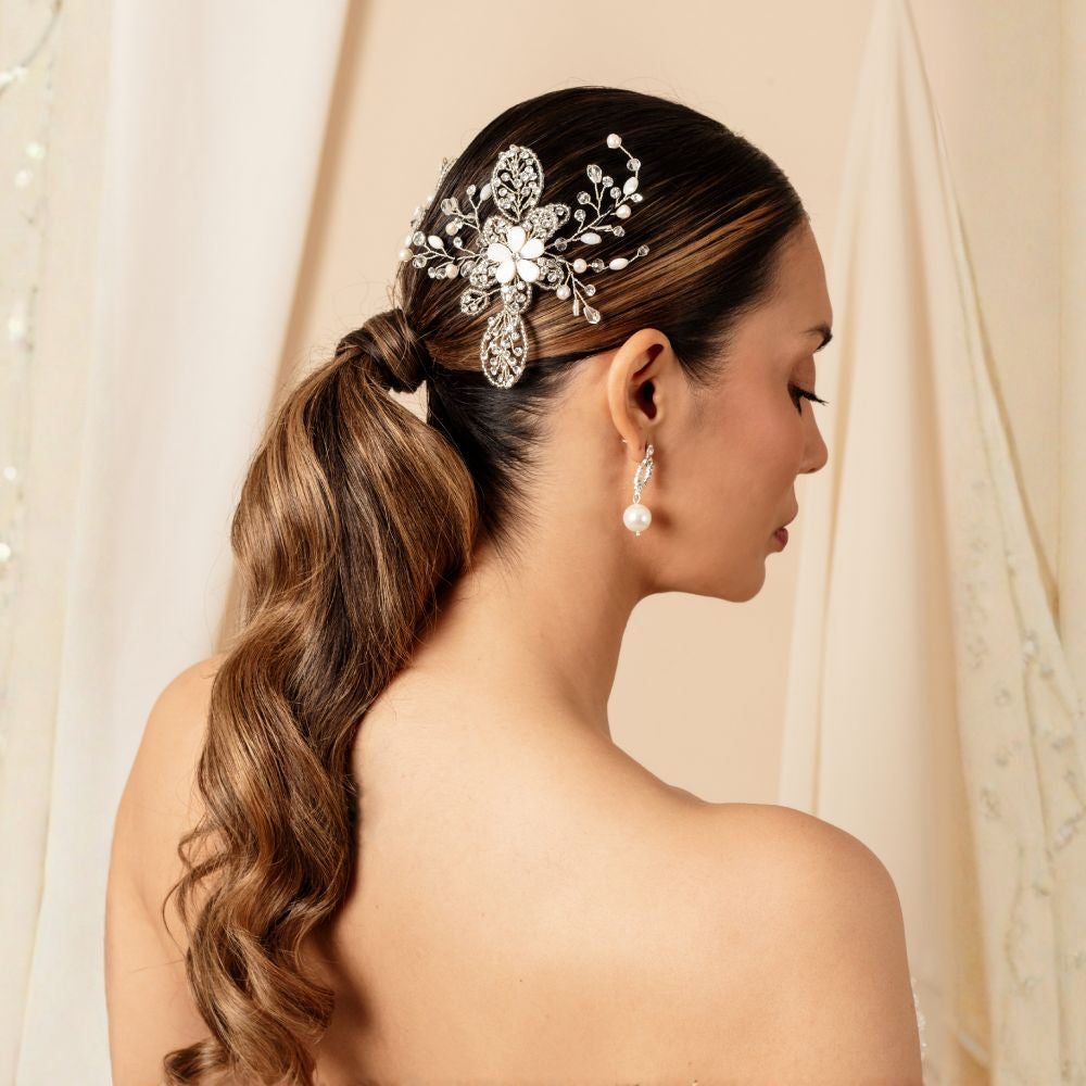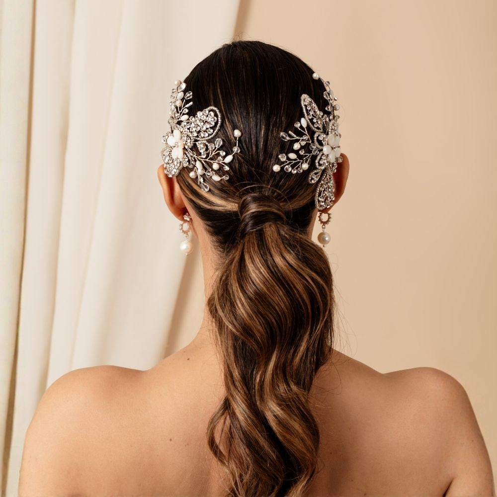 Su diseño evoca una distinción sutil y etérea, perfecta para bodas de tarde o de noche, donde el reflejo de los cristales realza el encanto luminoso y romántico. Ideal para novias que buscan un accesorio nupcial refinado con un toque celestial con un diseño versátil ideal para cualquier tipo de peinado.