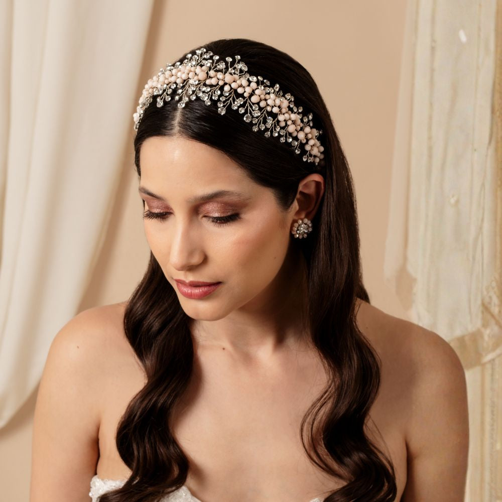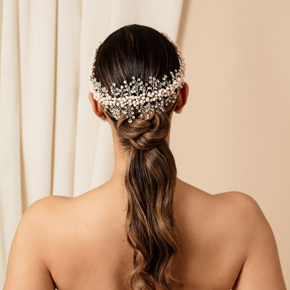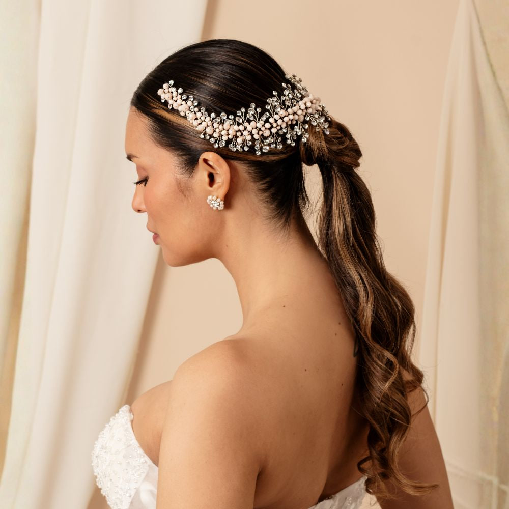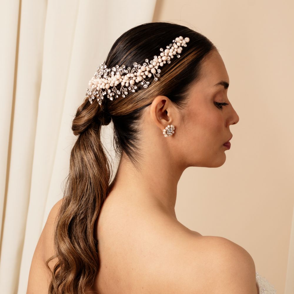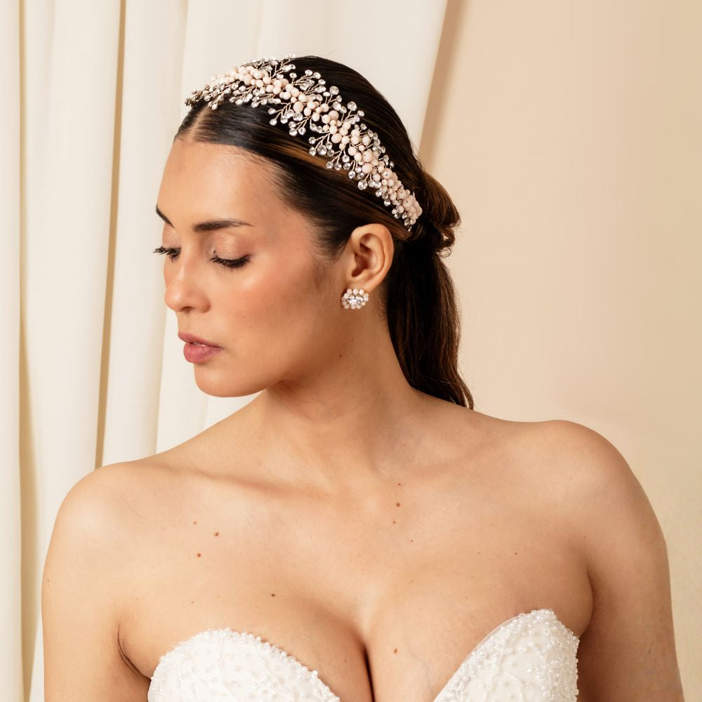 Su composición estalla como un jardín en flor, reflejando la riqueza del amor y la promesa de un futuro exuberante. Cada detalle expresa elegancia y fuerza interior, ideal para novias que buscan una pieza que simbolice plenitud y distinción. Además, por su versatilidad en su diseño se adapta a cualquier tipo de peinado.