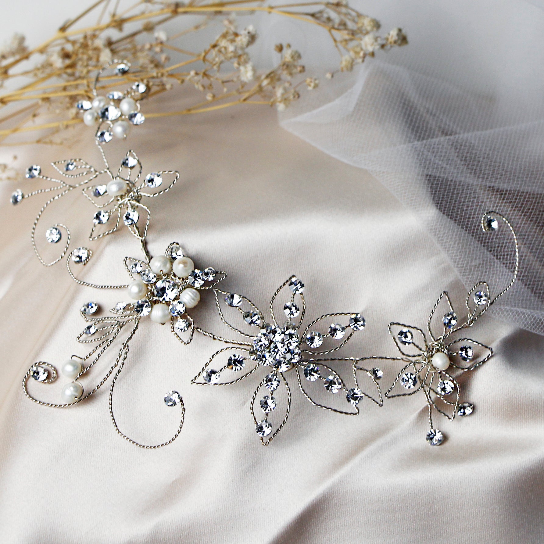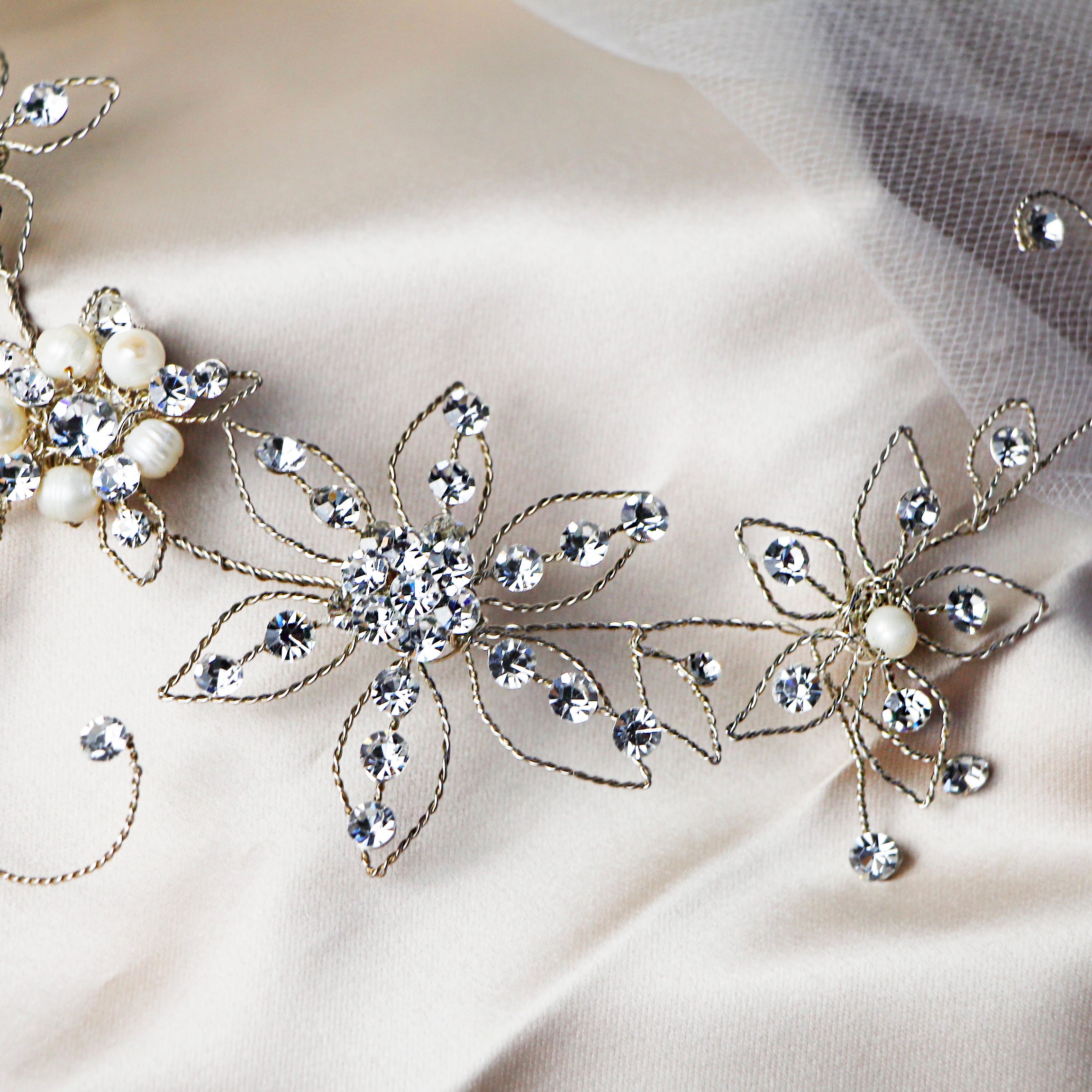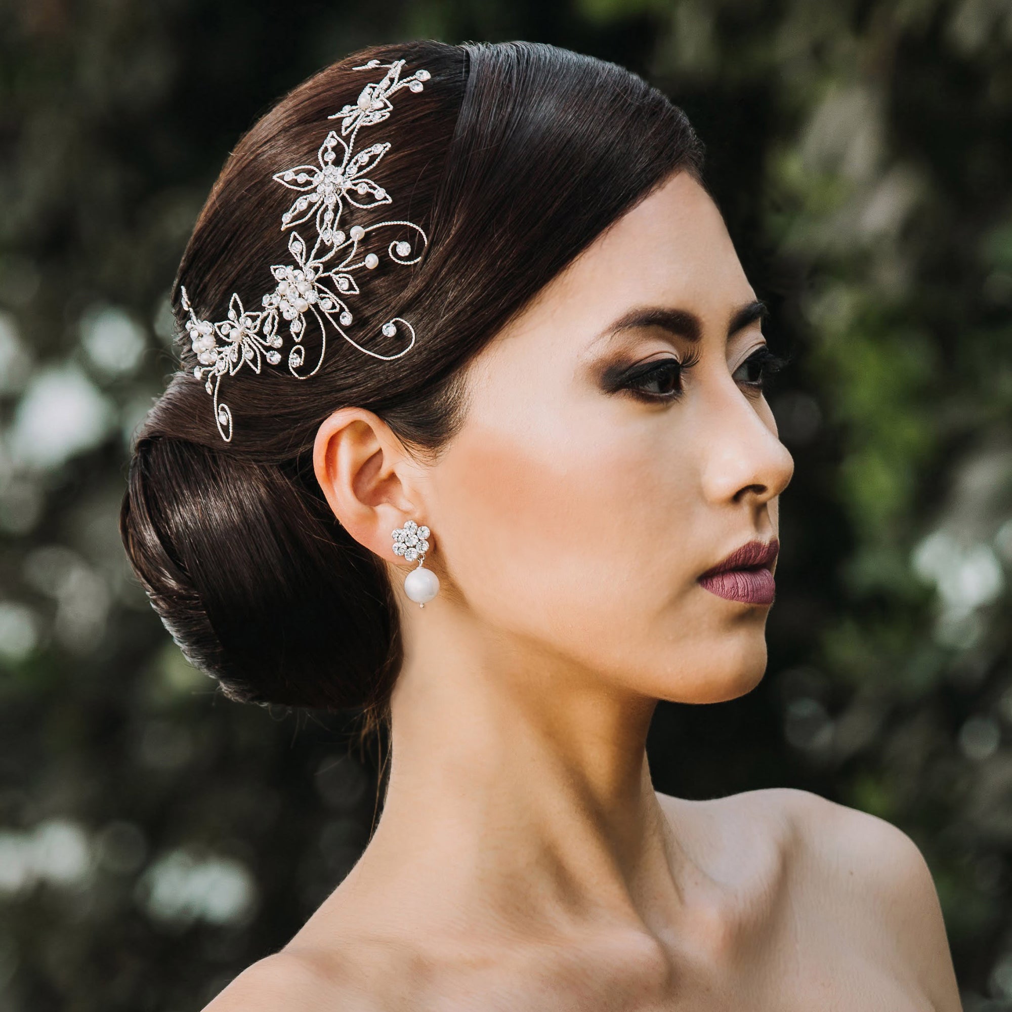 La Tiara Chabuca combina la delicadeza de la fina plata 950 con un diseño encantador de flores con perlas natules del río y cristal checo, creando una joya que resalta por su romanticismo y distinción. Ligera y flexible, se adapta con armonía a cualquier peinado nupcial.