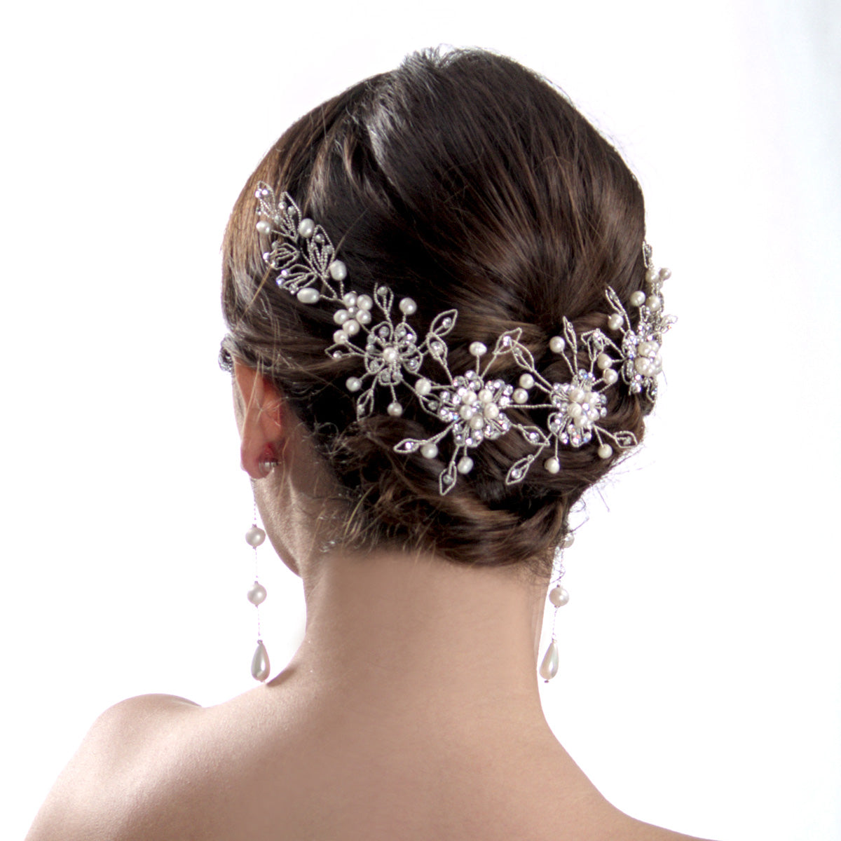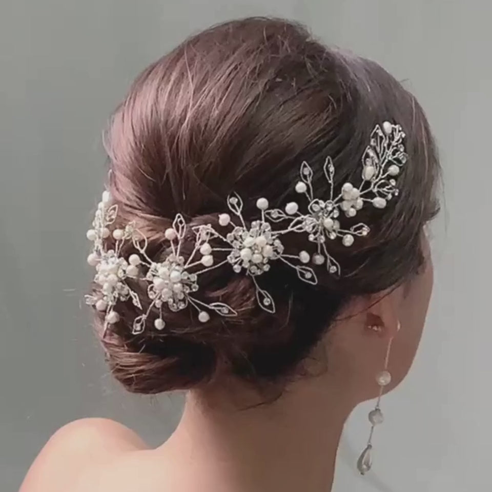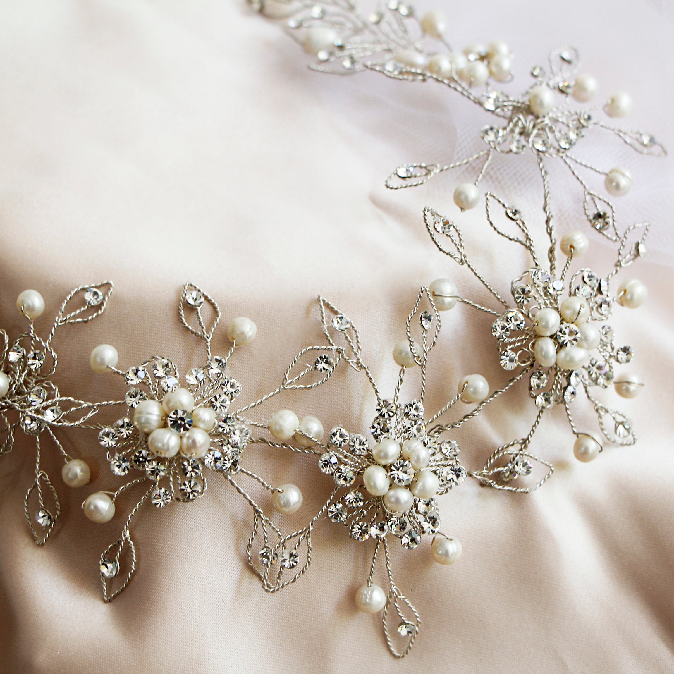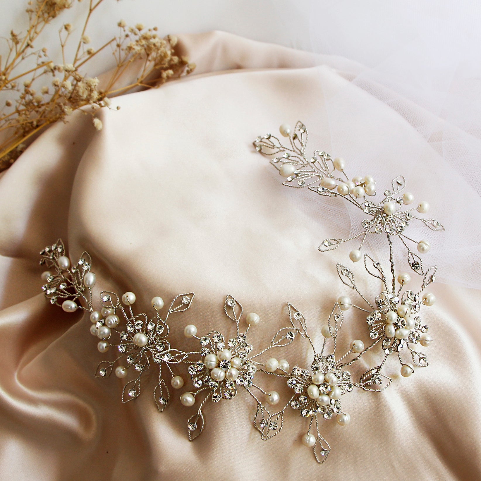 Esta tiara, confeccionada con finos hilos de plata peruana 950 y decorada con perlas naturales del rio y crystal checo, es la expresión perfecta de pureza y romanticismo. Su diseño flexible se adapta con delicadeza a cualquier peinado nupcial, aportando un brillo especial y femenino a tu look de boda.