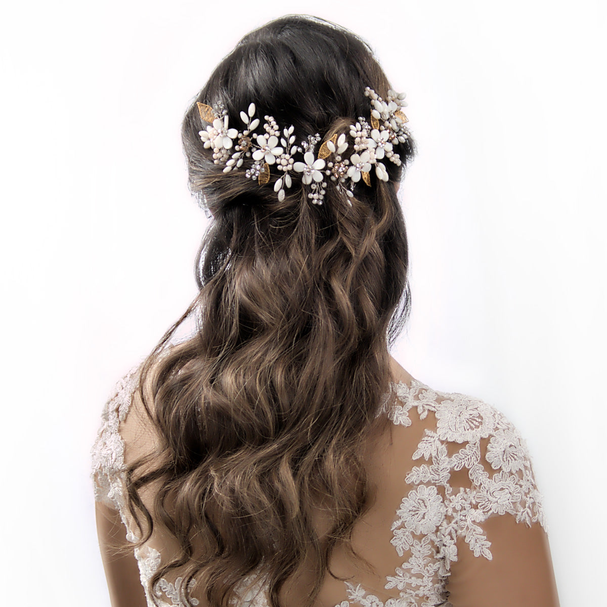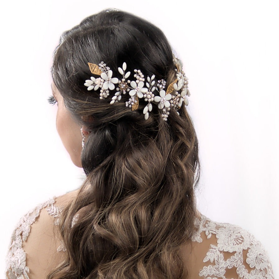 La Tiara Topacio, inspirada en la piedra del amor y la buena fortuna, está elaborada en plata 950 con delicados detalles bañados en oro de 18k. Su diseño flexible, adornado con crystal checo, muranos y nacar, se adapta a cualquier peinado, aportando un brillo sutil y elegante al look nupcial.