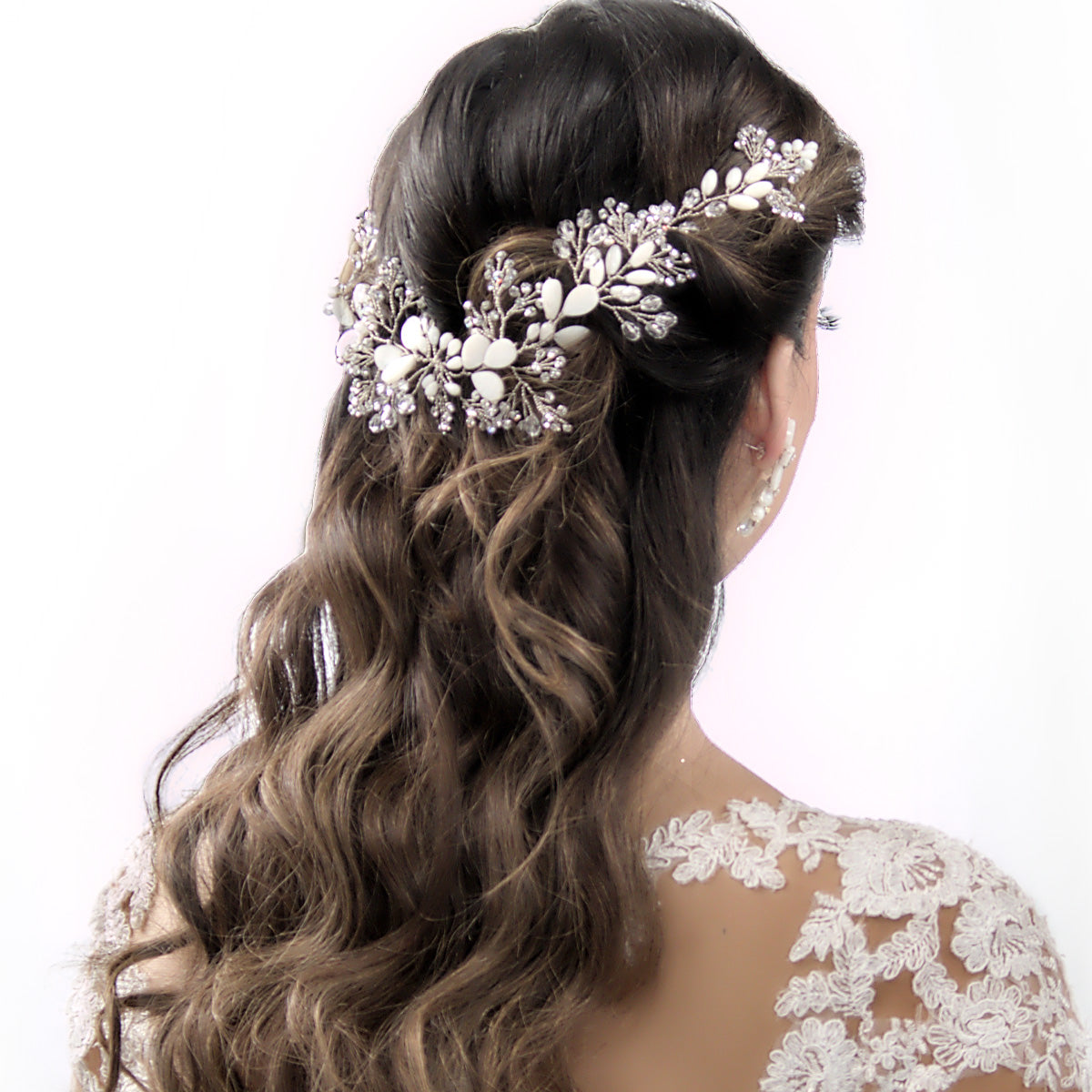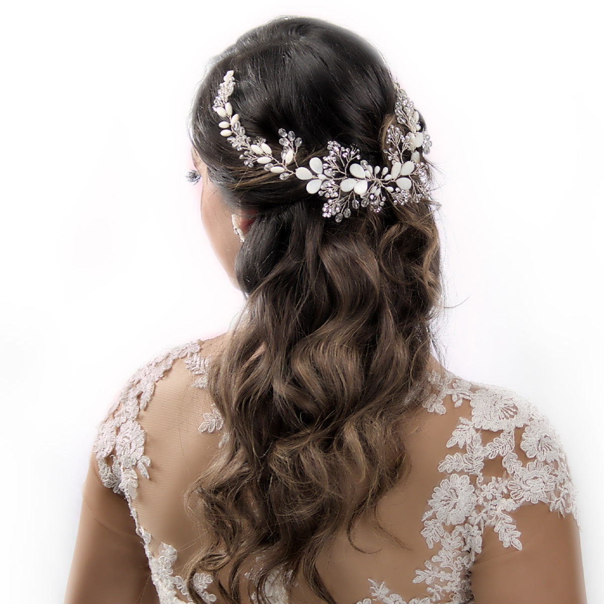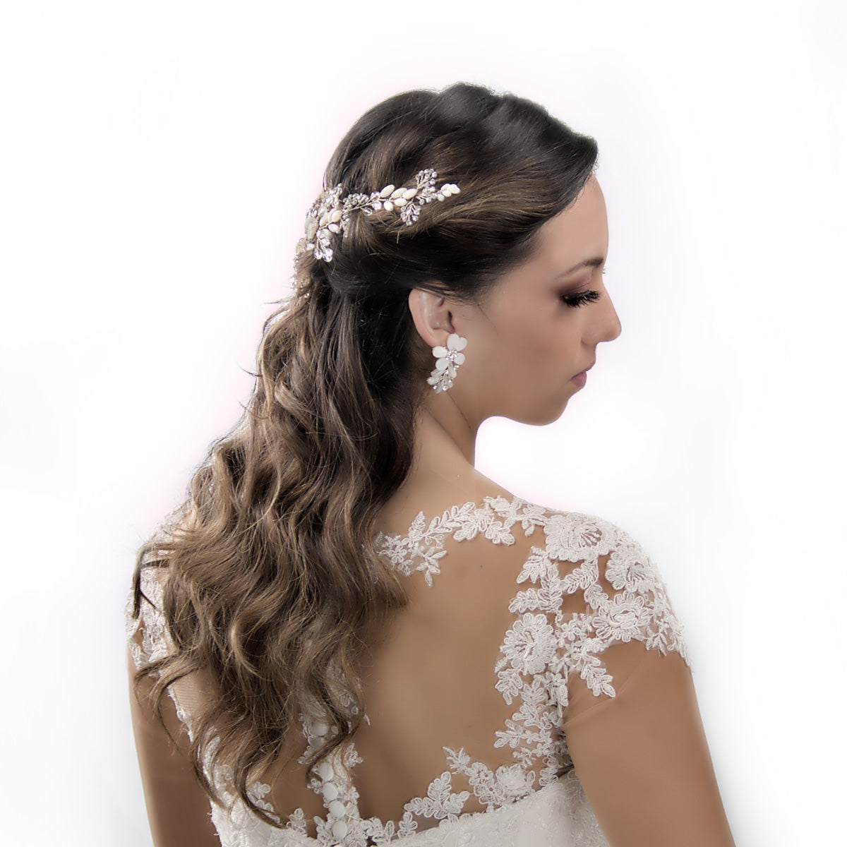 La Tiara Vesta, inspirada en la diosa del hogar y la familia, está hecha en fina plata 950 con delicados hilos de plata y adornos de múranos, nacar y cristal checo. Su diseño flexible se adapta con elegancia a cualquier peinado, evocando calidez, amor y armonía en el día de tu boda.