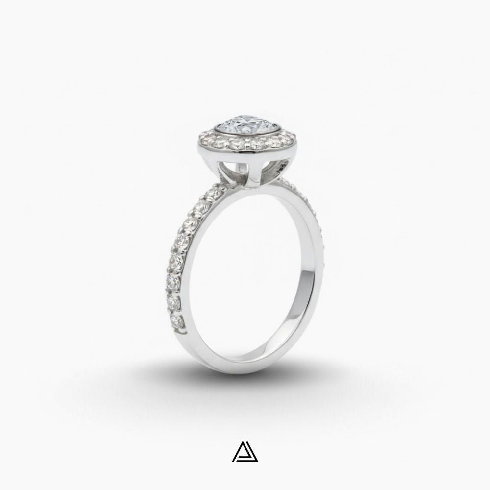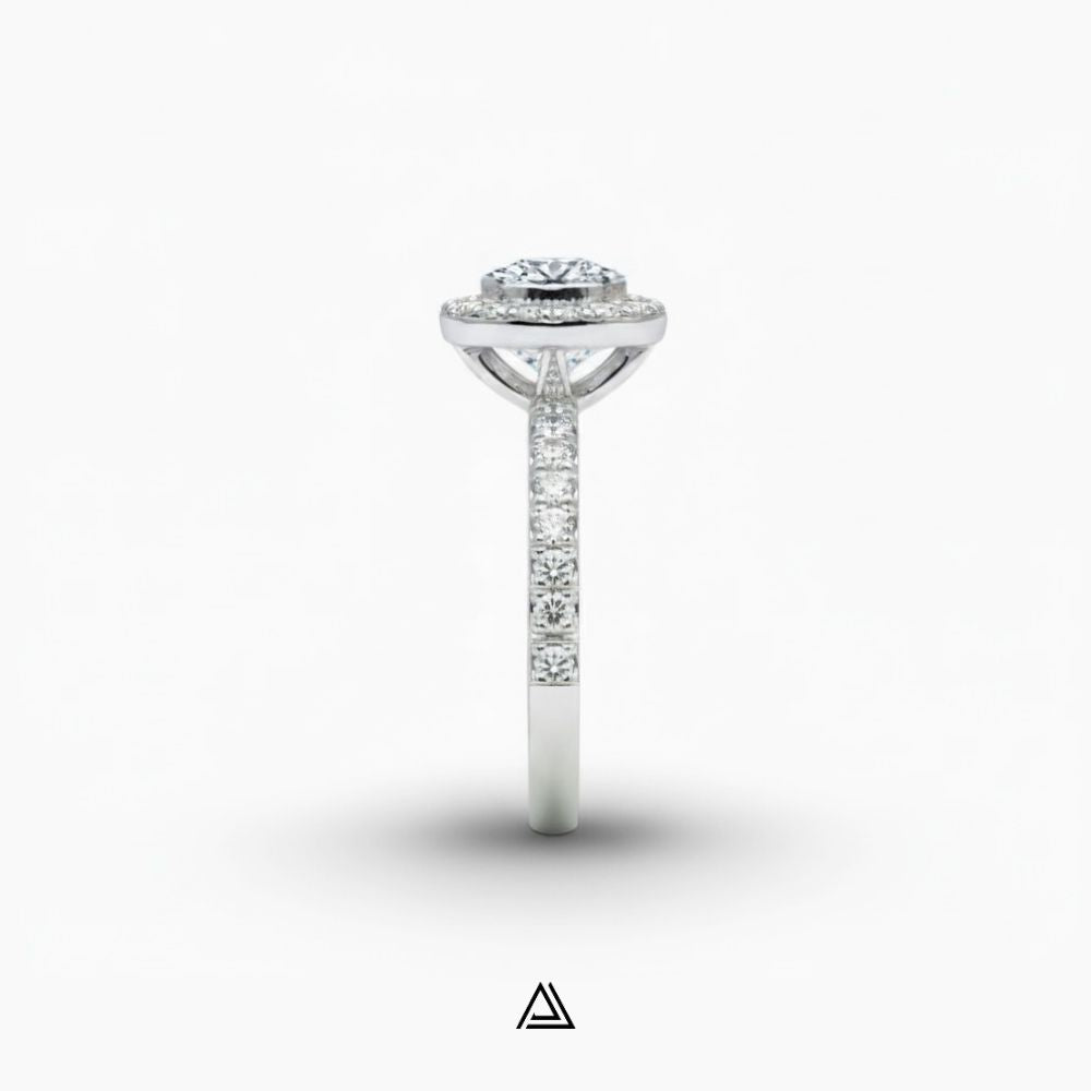 Palabras clave: aros de compromiso, oro blanco 18K, diamante de laboratorio, aros diamantados, anillos de boda, joyería fina, anillo halo pavé