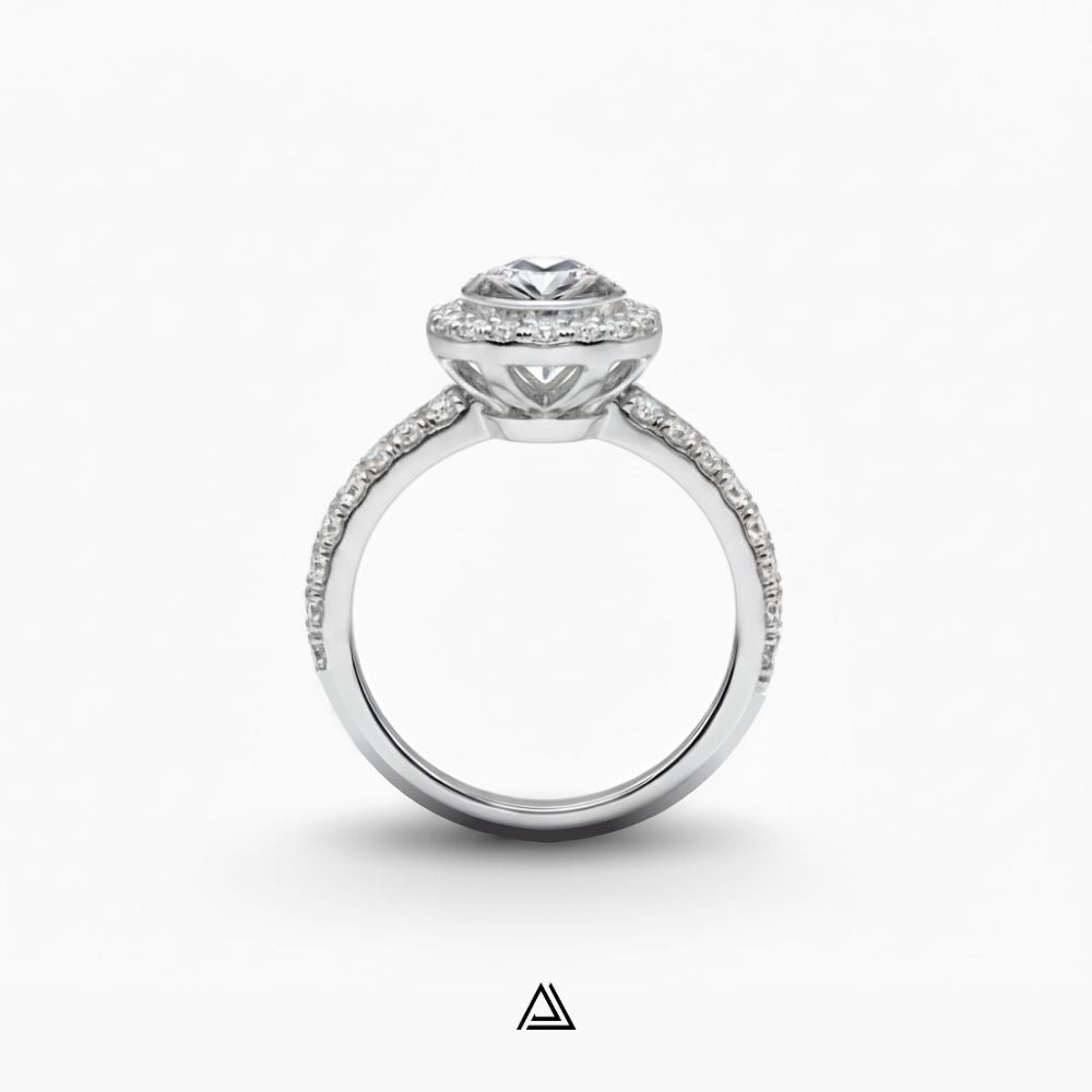 El diamante central, de corte brillante, se realza con un deslumbrante engaste de halo de pavé y está envuelto en un aro liso y pulido que actúa como una verdadera corona. La banda de la sortija se extiende con un delicado engaste pavé de diamantes de laboratorio (simulados), lo que garantiza un destello de 360 grados. Su acabado de alto brillo en oro blanco garantiza una pieza de joyería fina atemporal.