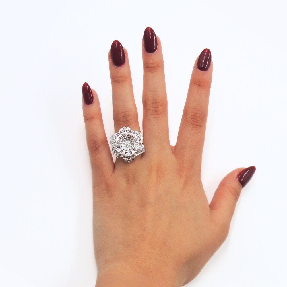 El Anillo “Lys” es una joya de plata 950 que fusiona la opulencia vintage con la elegancia del calado en filigrana. Inspirado en la flor de lis, símbolo de pureza, nobleza y fortaleza interior, su diseño en forma de flor presenta una textura de encaje metálico que destaca por su distinción y detalle. Ideal para quienes buscan un anillo grande y elegante, esta pieza de joyería clásica irradia lujo atemporal y un significado profundo en cada ocasión.