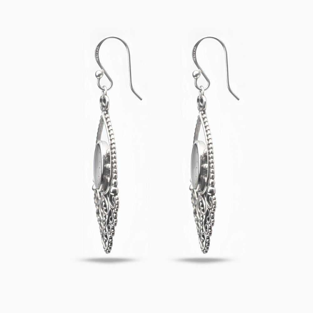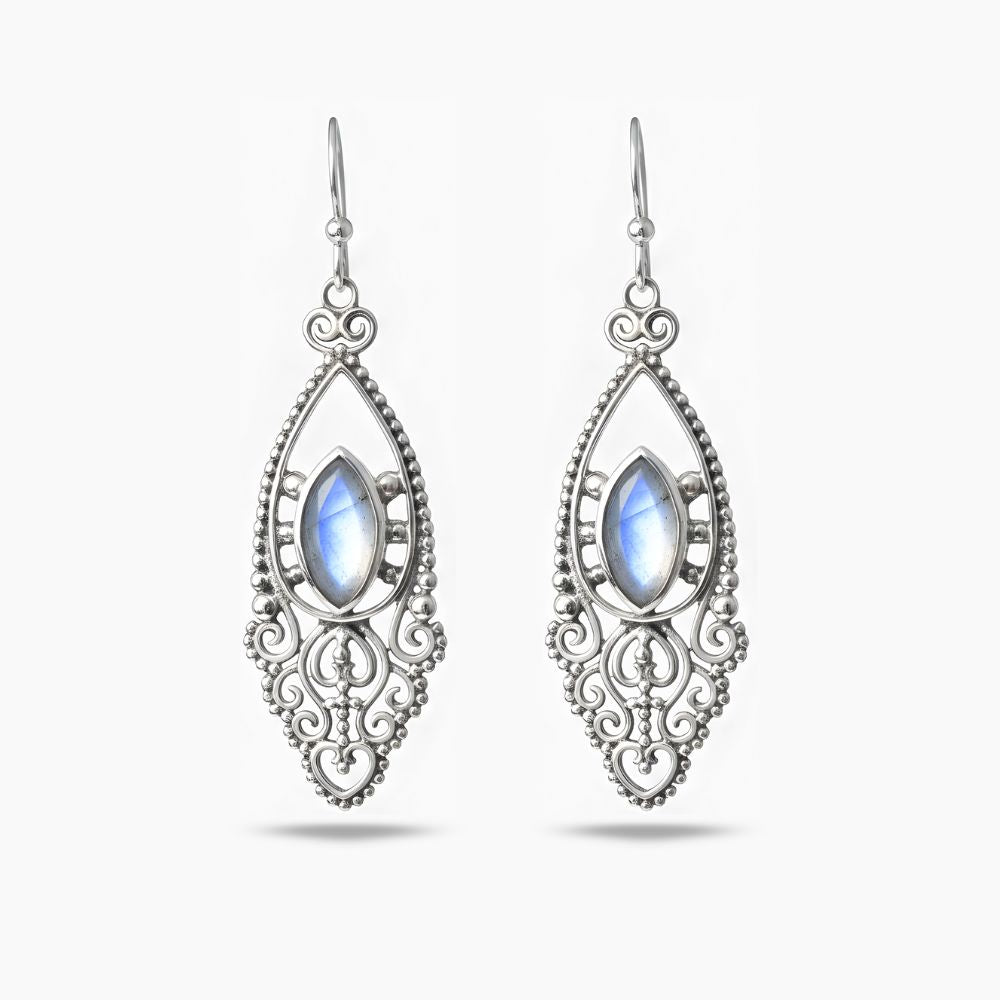 Los Aretes “Aveline” son una refinada oda al romance clásico, la feminidad y la elegancia majestuosa. Elaborados en Plata Peruana 950 y realzados con una piedra labradorita, evocan la grandeza de la joyería de herencia europea. Su silueta de gota invertida, acompañada de delicados arabescos y bordes perlados, crea una composición visual rica en profundidad y carácter. En el centro, una gema en corte marquesa captura la luz para revelar sutiles destellos azulados, generando un contraste hipnótico que envuelve la pieza en un aura etérea y sofisticada.