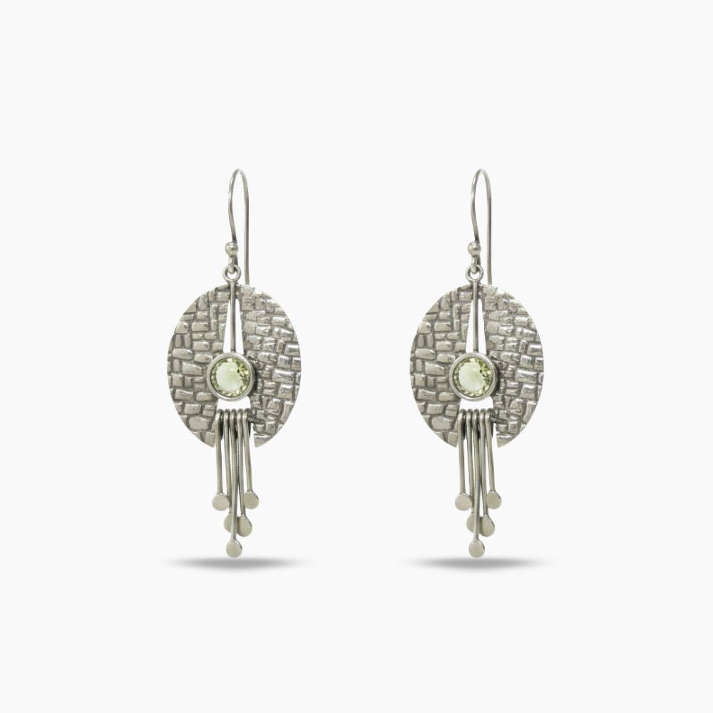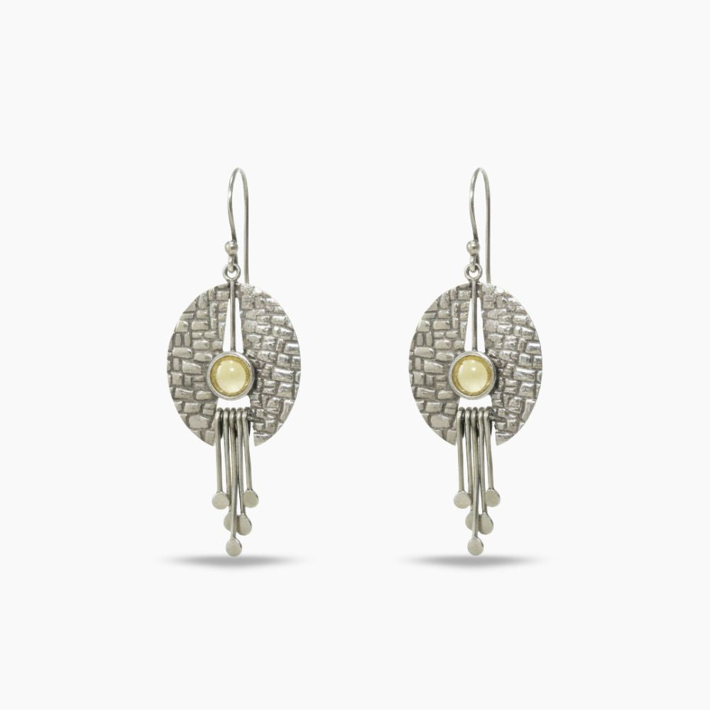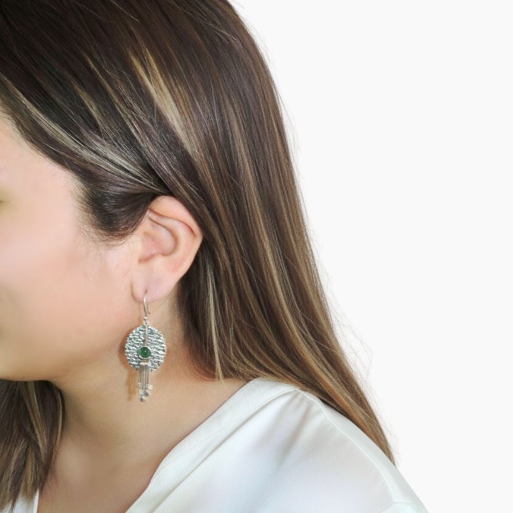 Los Aretes “Armonía Cósmica” destacan por su profundo simbolismo de equilibrio, sanación y unidad, integrando la energía de la tierra con la fluidez del espíritu. Su placa ovalada de textura rústica evoca patrones naturales y tejidos ancestrales, mientras su centro representa la armonía emocional y los flecos inferiores simbolizan el flujo libre de la energía vital, creando un accesorio que transmite conexión, bienestar y belleza consciente.