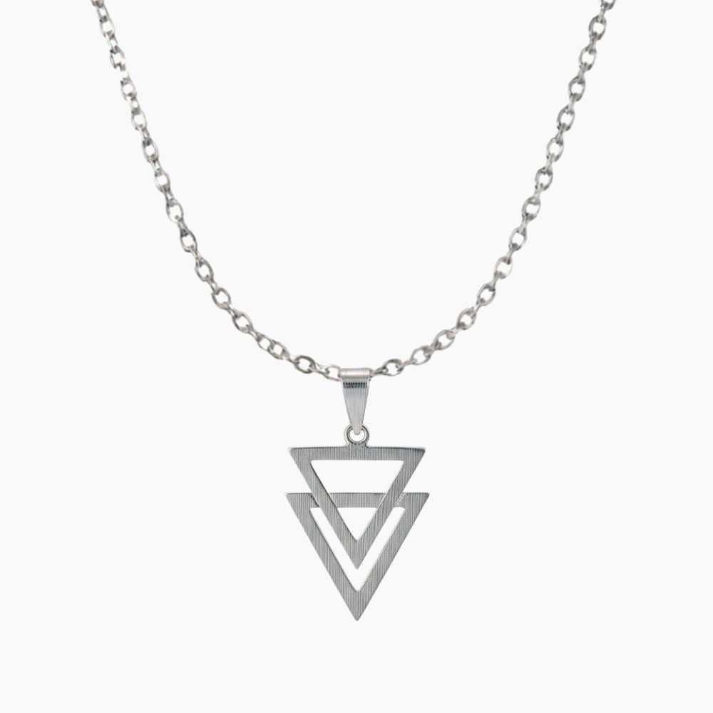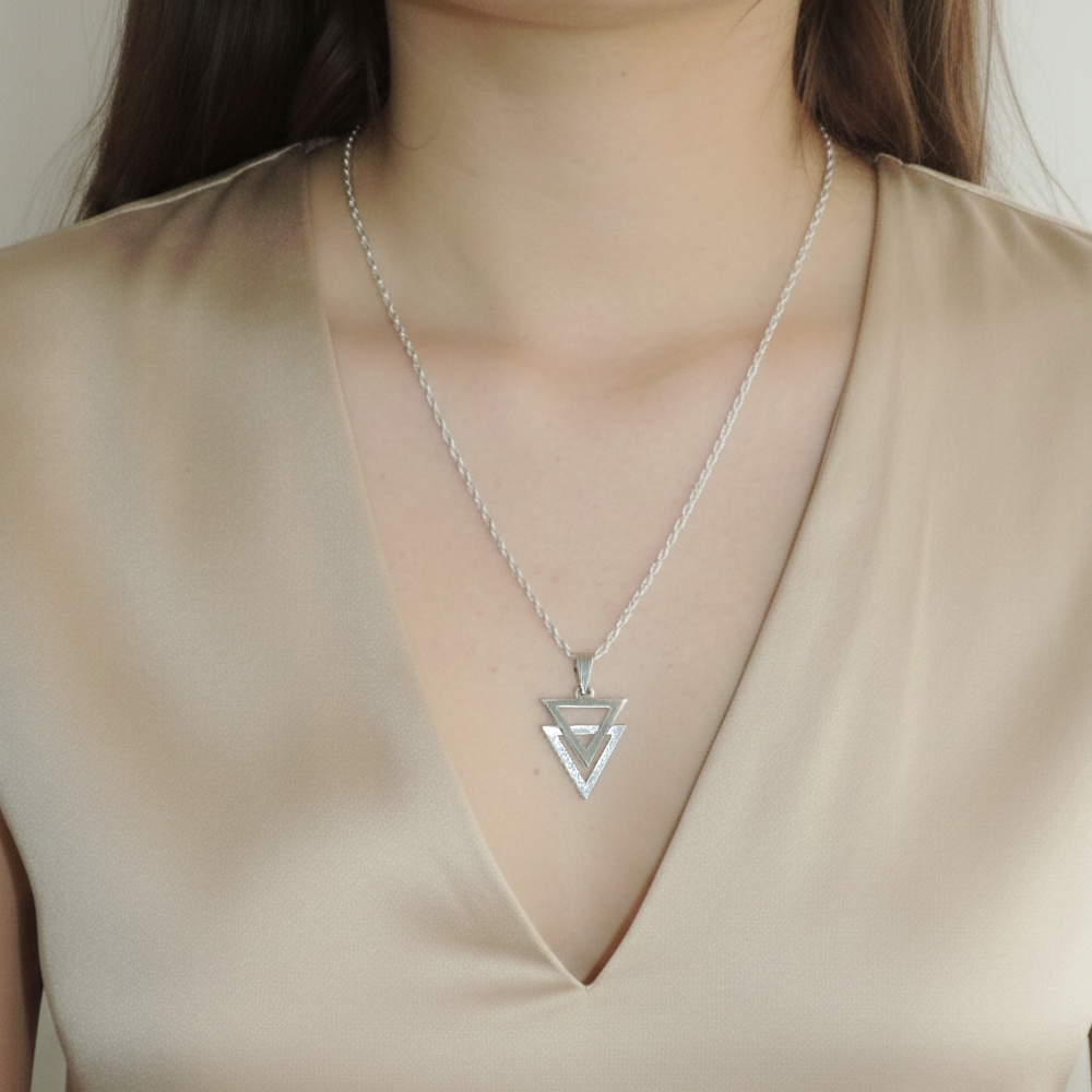 El Collar “Aether” expresa un profundo simbolismo de conciencia, guía interior y equilibrio sagrado, representado por dos triángulos entrelazados que evocan la conexión del ser con la luz divina. Su diseño moderno con sutil textura lineal dirige la energía hacia el corazón, inspirando claridad y estabilidad emocional, convirtiéndolo en un amuleto de iluminación y una excelente opción de regalo para quienes buscan significado y armonía espiritual.
